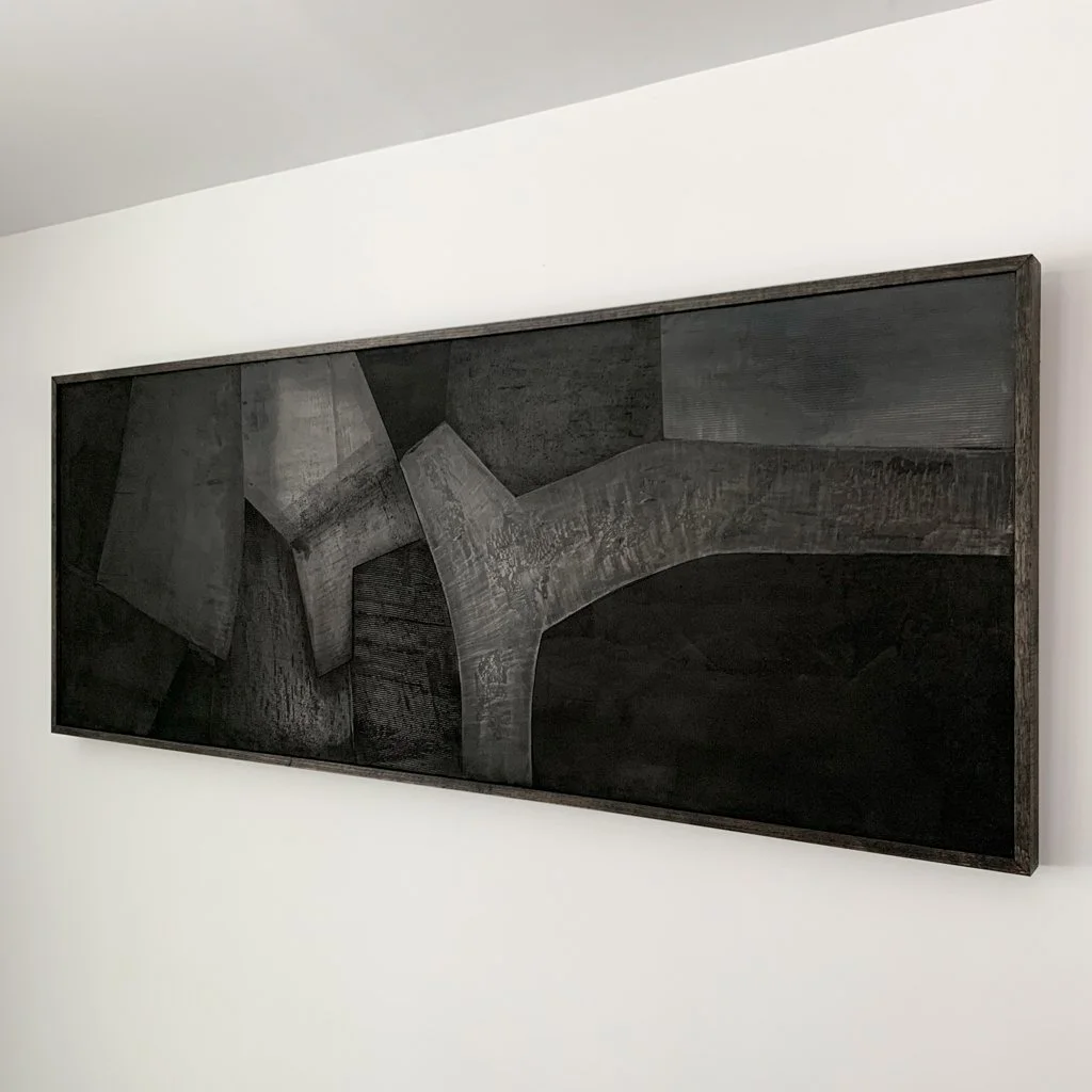 Hortobagy 01 is a textural relief developed from archaic mineral plasters, exploring geometric relationships and material boundaries through layered mineral application.