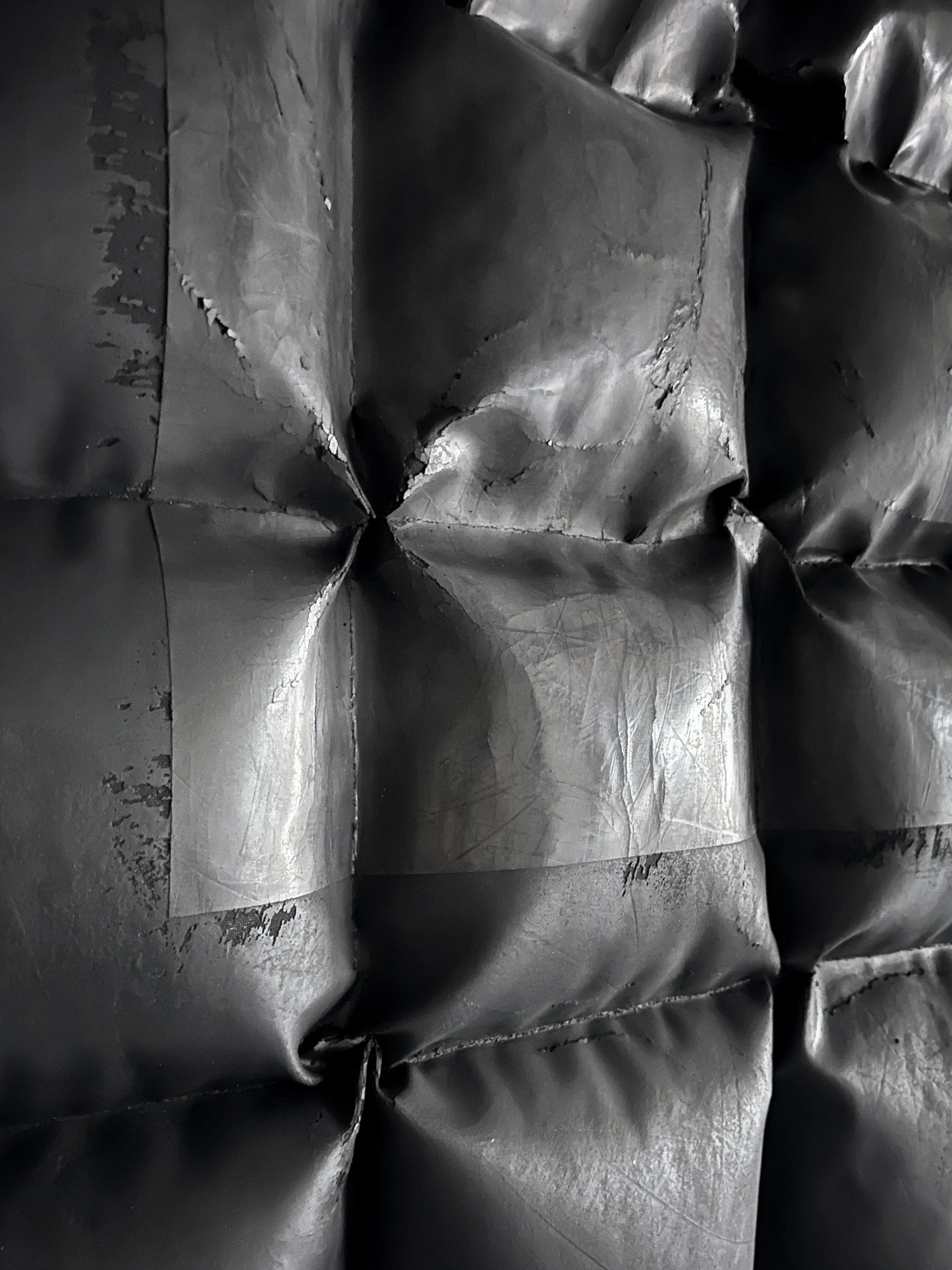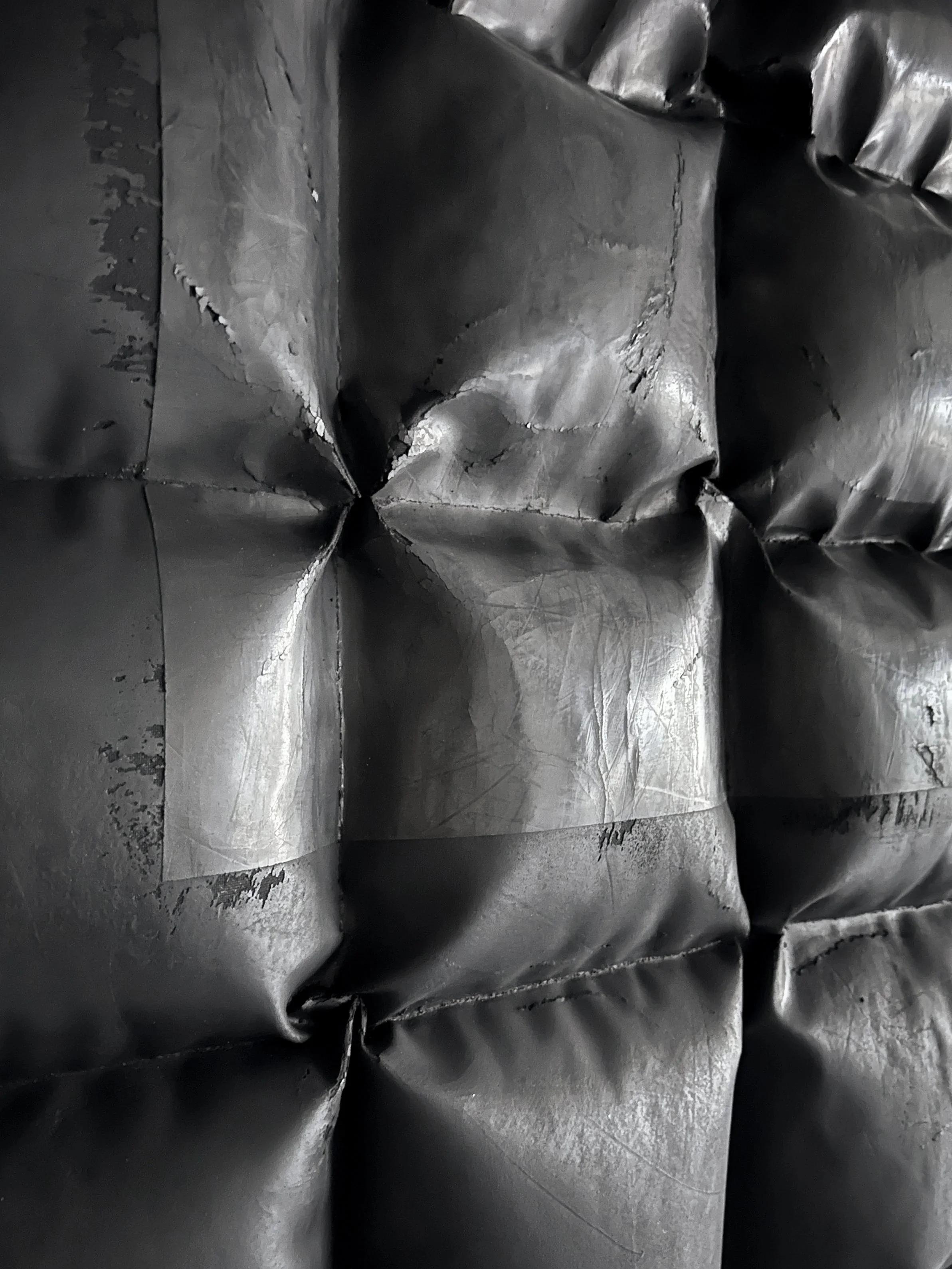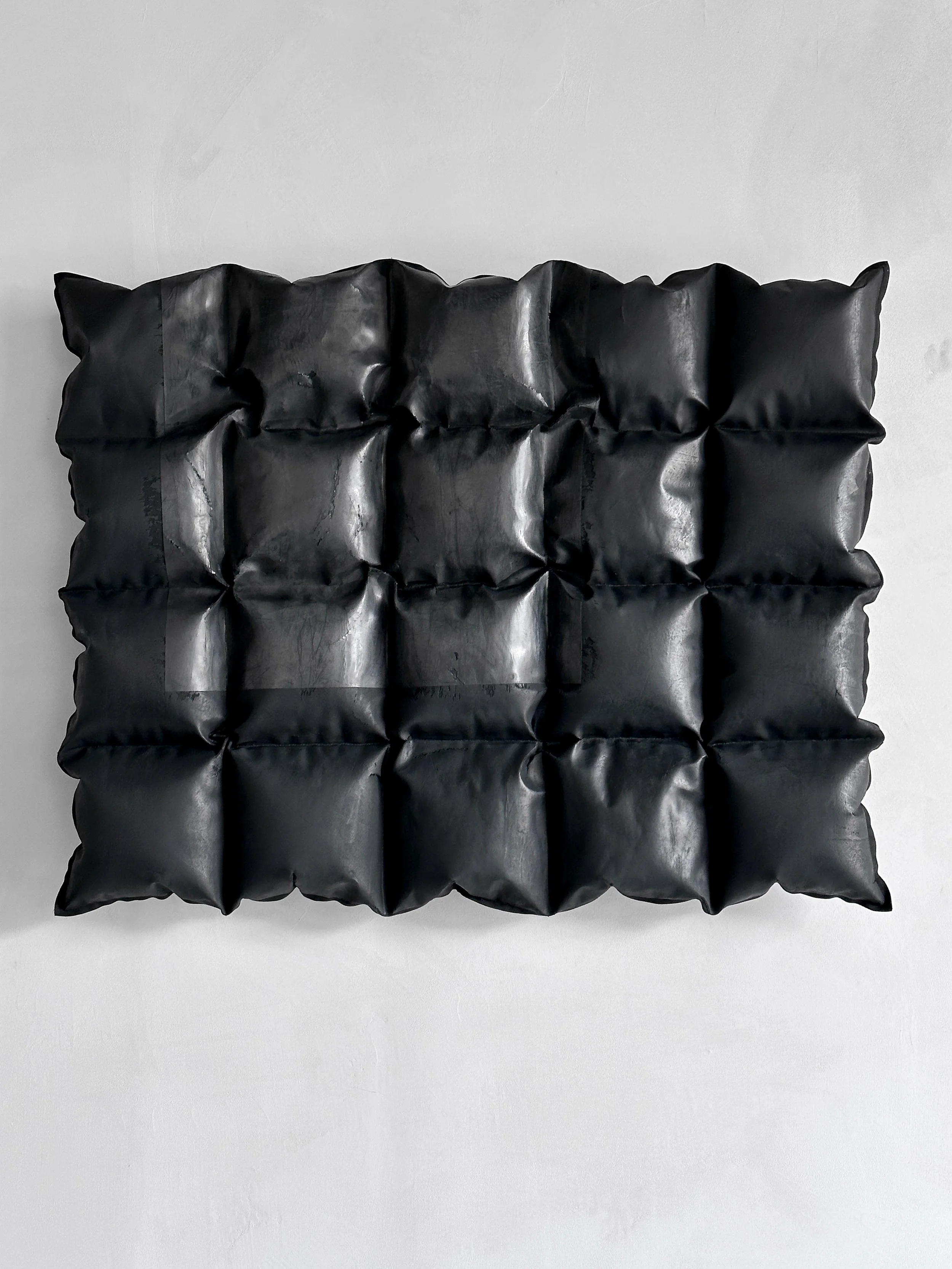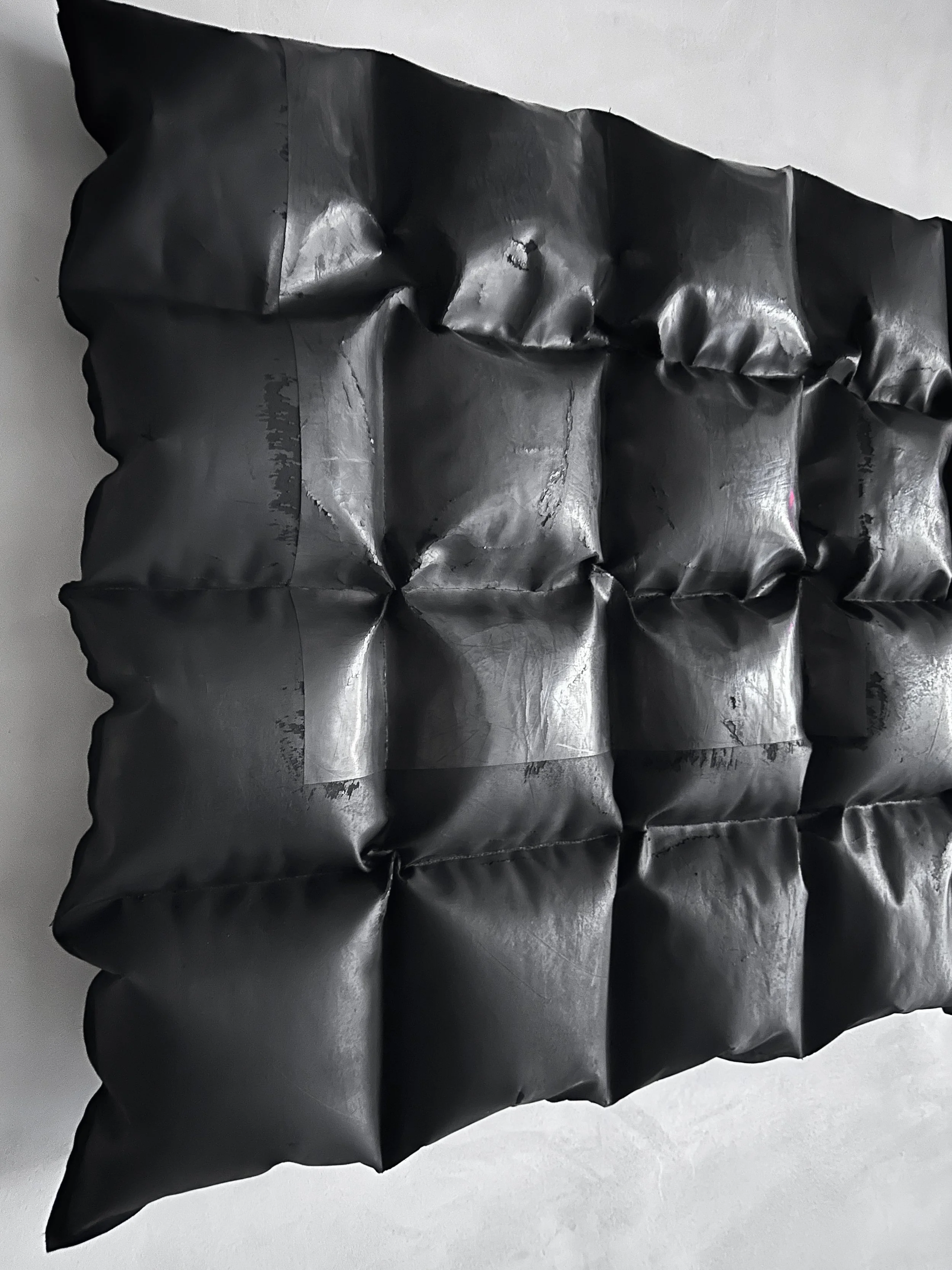 Aligning with his goal of reconceptualizing the possibilities of plaster, Varga’s new series pushes the material limits by stretching, folding, creasing, and sculpting this rigid material and creating pillow-like sculptures that combine various sheens and textures inlaid with desired cracks and folds.
