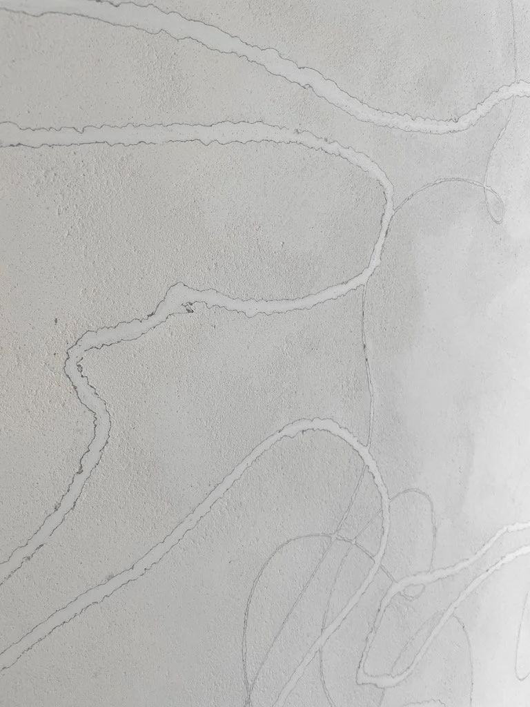 Observing the architecture of the body - the way skin moves over bone, the sculptural tension of muscle, and the ways bodies connect and intertwine - informs the layered compositions within the work. Through symmetry, relief, and successive applications of plaster, these gestures are translated into mineral surfaces where form and movement emerge through the working of the material itself.
