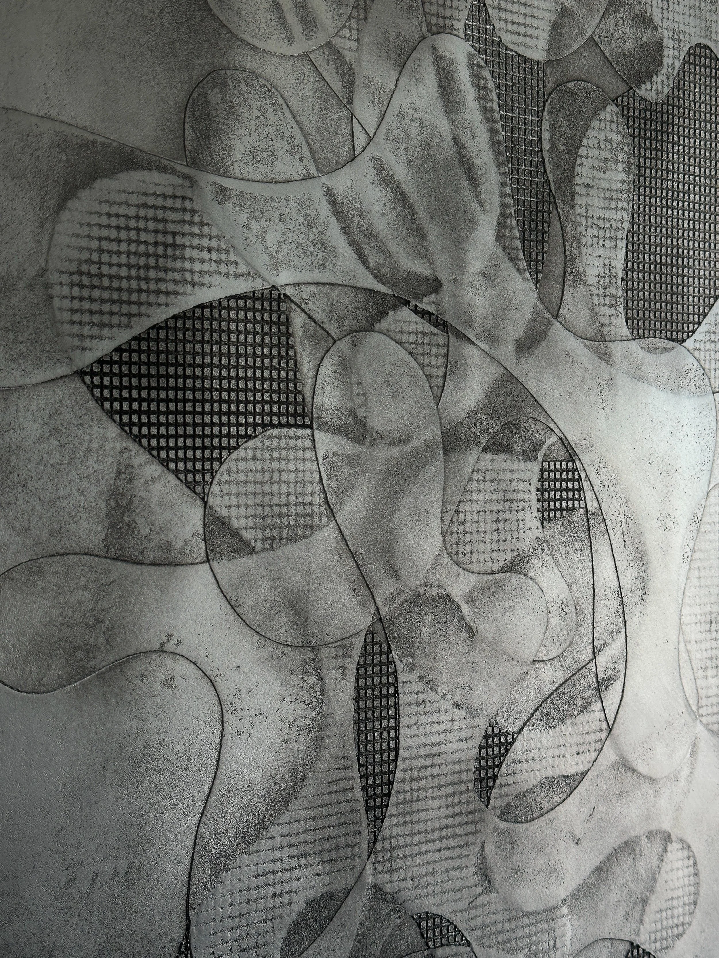 Observing the architecture of the body - the way skin moves over bone, the sculptural tension of muscle, and the ways bodies connect and intertwine - informs the layered compositions within the work. Through symmetry, relief, and successive applications of plaster, these gestures are translated into mineral surfaces where form and movement emerge through the working of the material itself.
