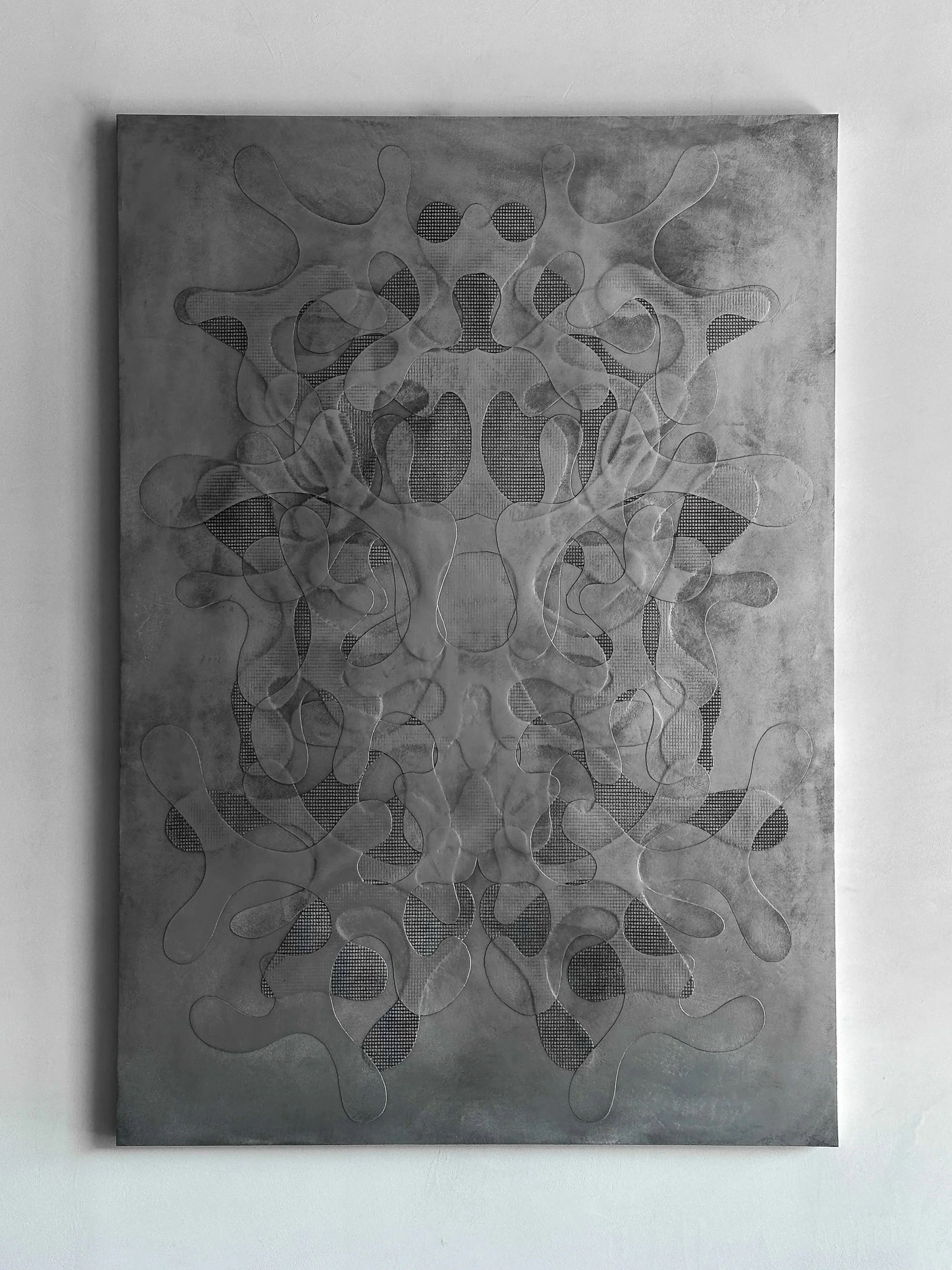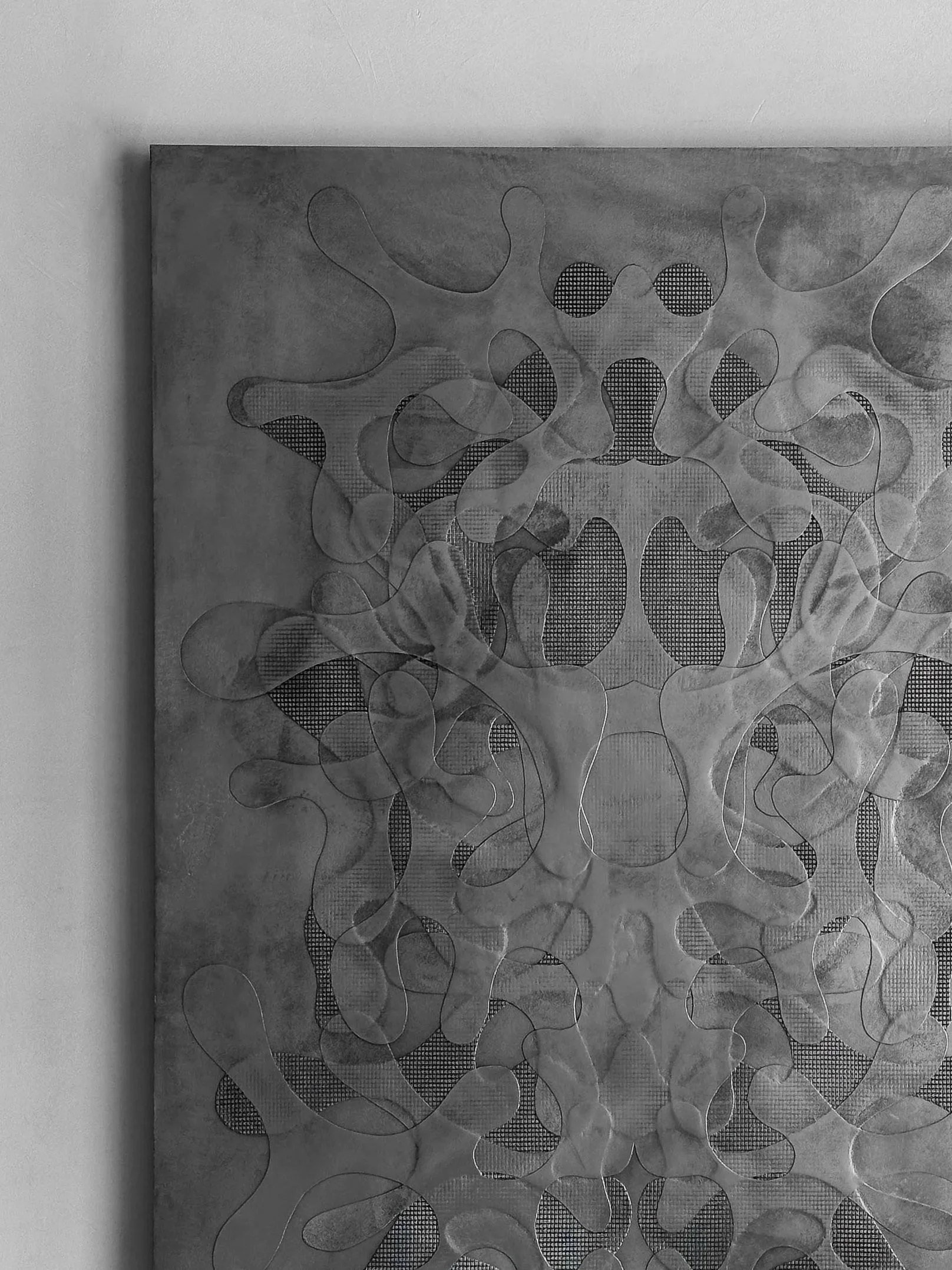 SoldRorschach 05 is a plaster relief developed from archaic mineral plasters, exploring surface depth and symmetry through layered mineral application.