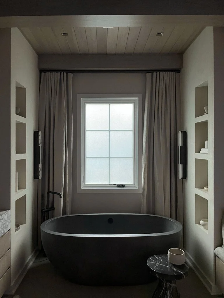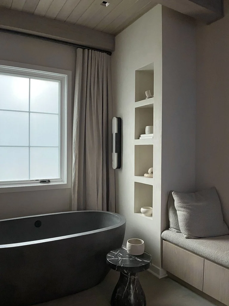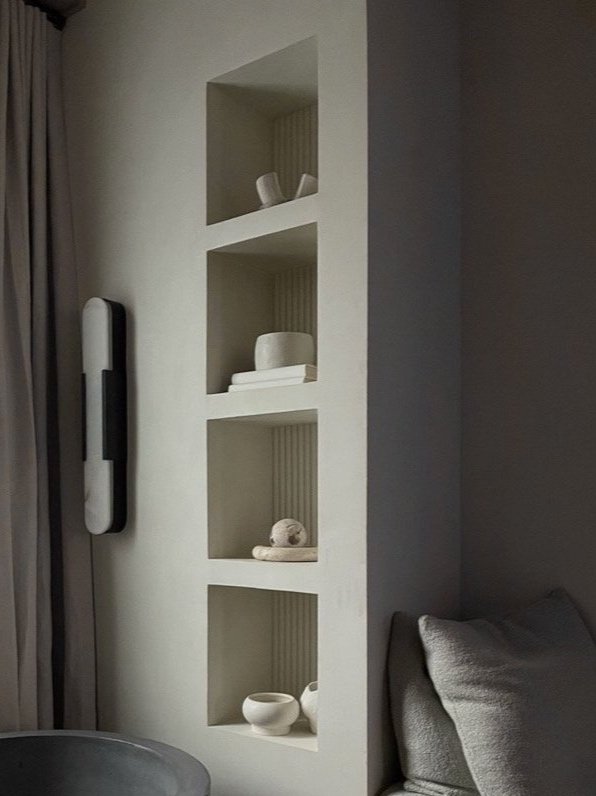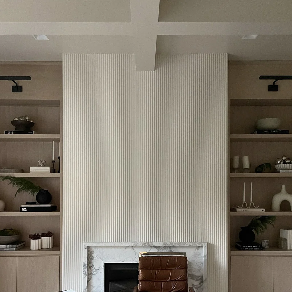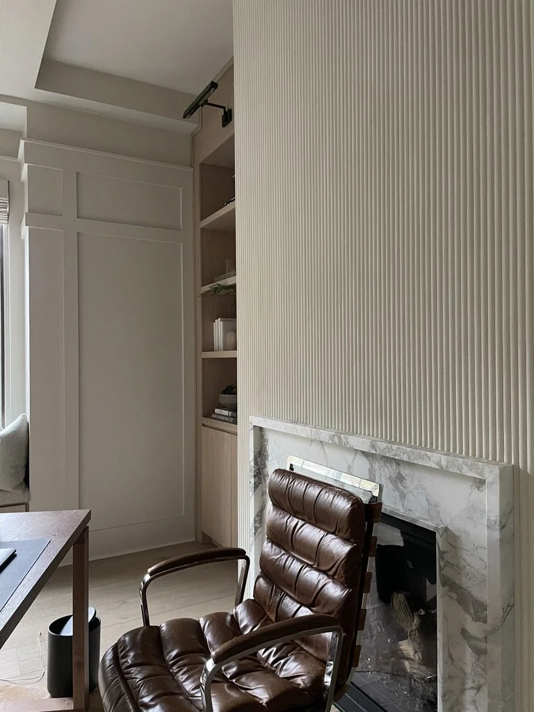 Textural plaster finish on walls of bath with built-in plaster shelving and fluted plaster detailing. Fluted plaster fireplace in office.