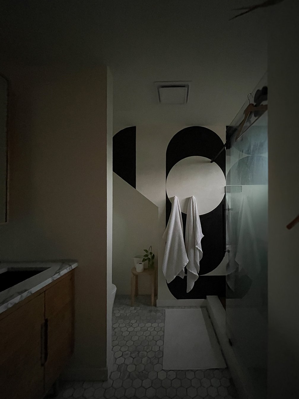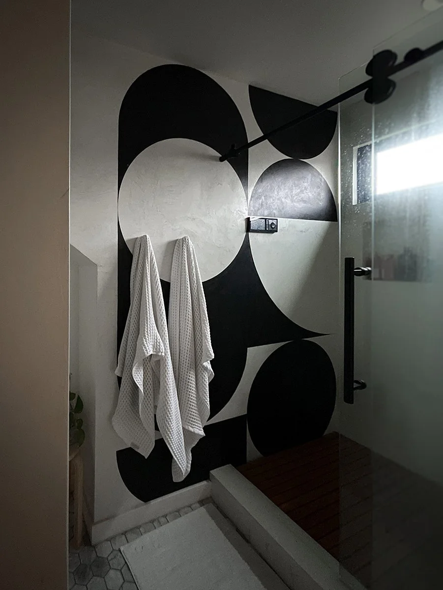 Tadelakt plaster applied to walls and floor of shower finished with a large-scale geometric pattern. Since his home was intricately self-designed and self-built, in and of itself a work of art - he reached out open ended, looking to bring an experience to a space that he uses daily.
