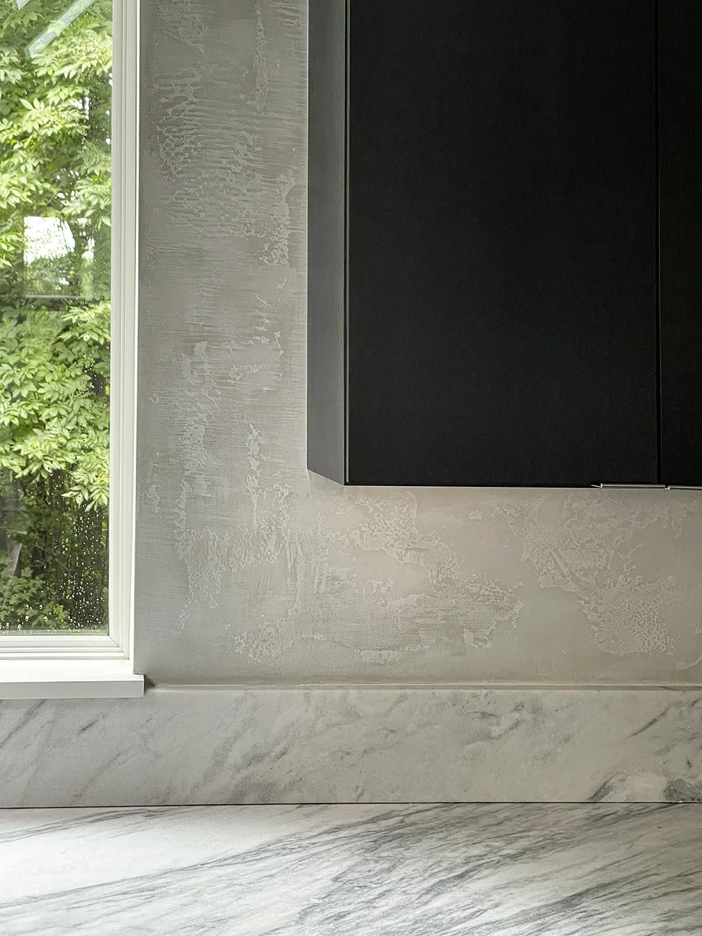 Textural grey plaster and wax sealant applied to kitchen backsplash in lieu of standard tile.