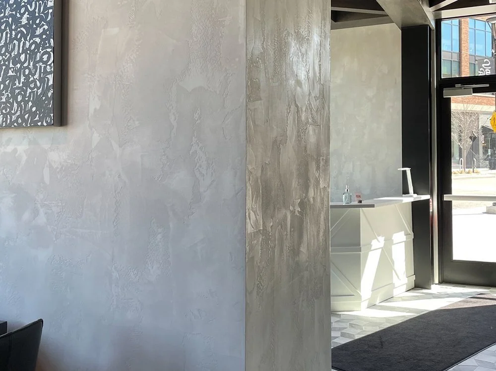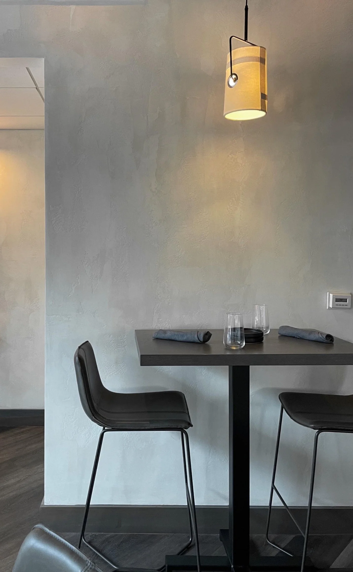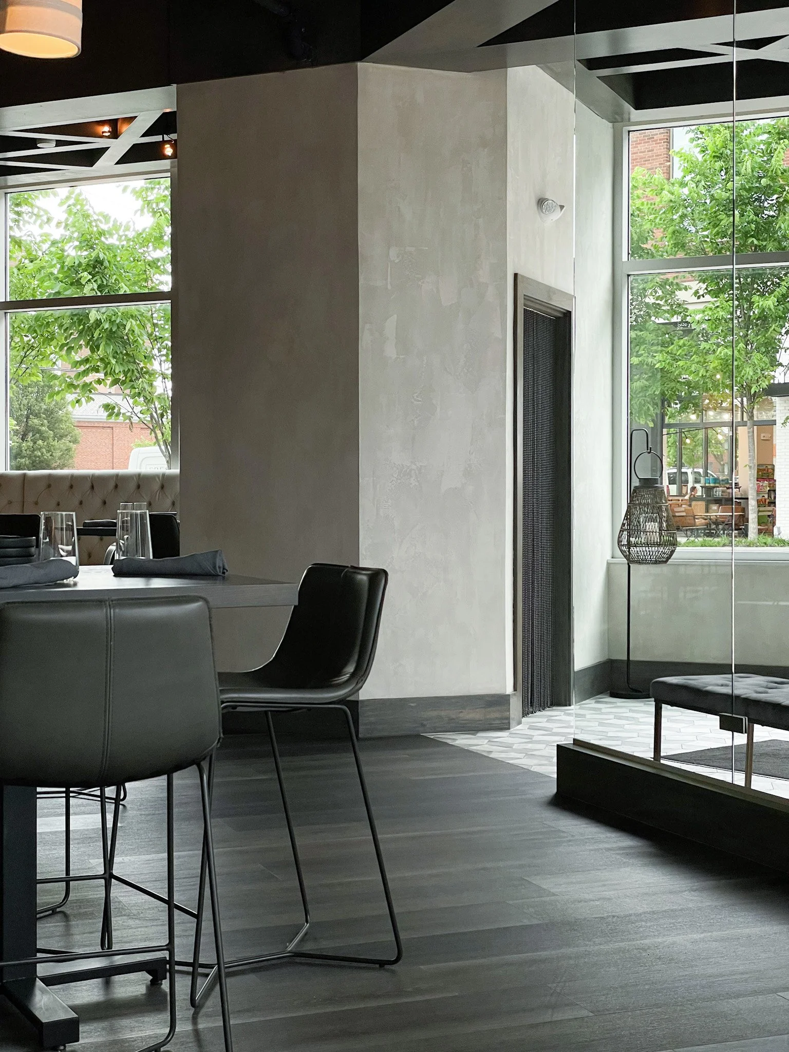 Textural plaster and limewash applied to all restaurant-facing walls in newly renovated restaurant. Application involved three layers of plaster, one layer of limewash, and one layer of protective wax.